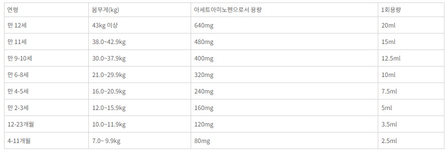 - 4-11개월: 7.0~9.9kg - 80mg (2.5ml)